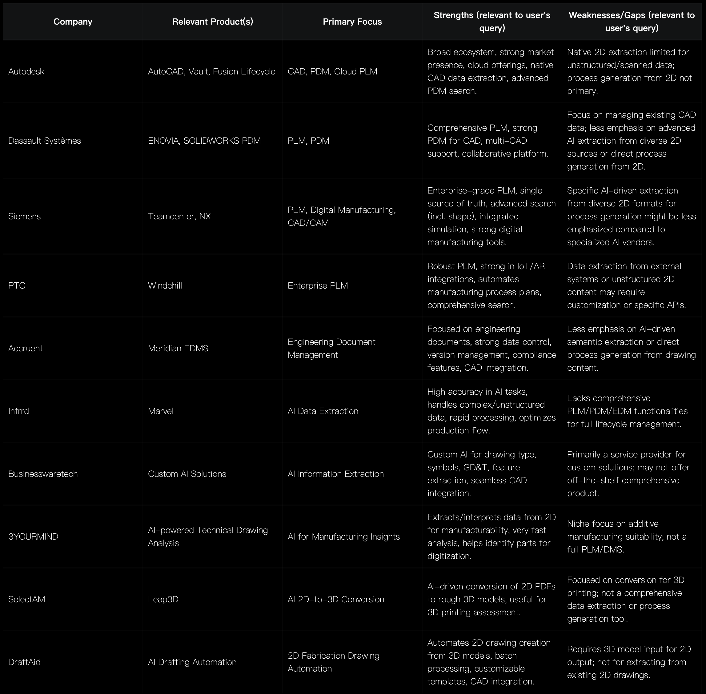 The competitive landscape presents a dichotomy between comprehensive PLM/PDM suites offered by major players and highly specialized AI-driven tools. This suggests that a new software solution must strategically decide its positioning. It can either aim to be a "best-of-breed" solution that excels in its specific functionalities—information extraction, intelligent search, and process generation from 2D drawings—and then integrate seamlessly with existing enterprise systems, or attempt to build out a more comprehensive suite. The former approach appears more viable initially, allowing for deep specialization and rapid innovation in its core areas.