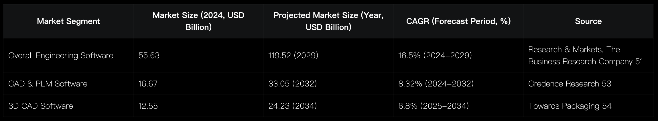 The global engineering software market is experiencing robust growth, driven by pervasive digital transformation initiatives across industries. The market was valued at approximately $55.63 billion in 2024 and is projected to grow to $64.97 billion in 2025, demonstrating a Compound Annual Growth Rate (CAGR) of 16.8%. This rapid expansion is anticipated to continue, with forecasts indicating a market size of $119.52 billion by 2029, maintaining a CAGR of 16.5%.51 Another assessment of the CAD and PLM software market specifically valued it at $16.67 billion in 2024, with projections to reach $33.05 billion by 2032 at an 8.32% CAGR.53 Focusing solely on 3D CAD software, the market size was $12.55 billion in 2024, with a projected growth to $24.23 billion by 2034 at a CAGR of 6.8%.54