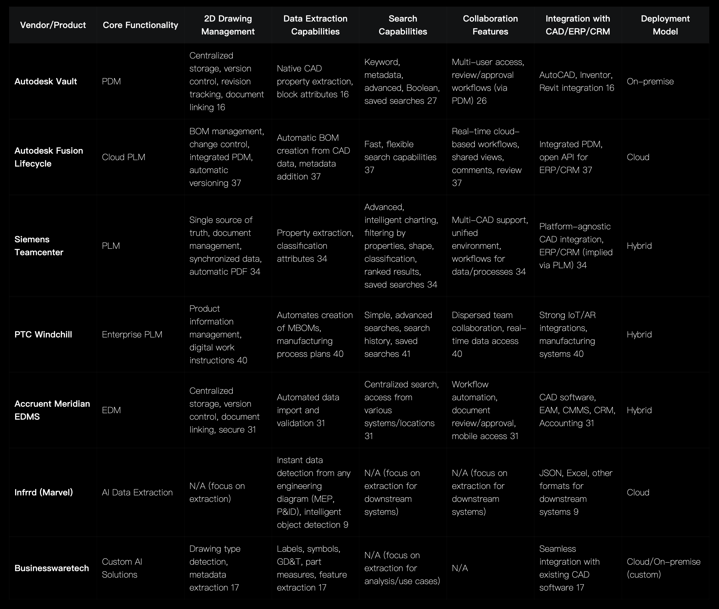 Table 1: Comparison of Key PDM/PLM/EDM Systems for 2D Drawing Management & Search Capabilities